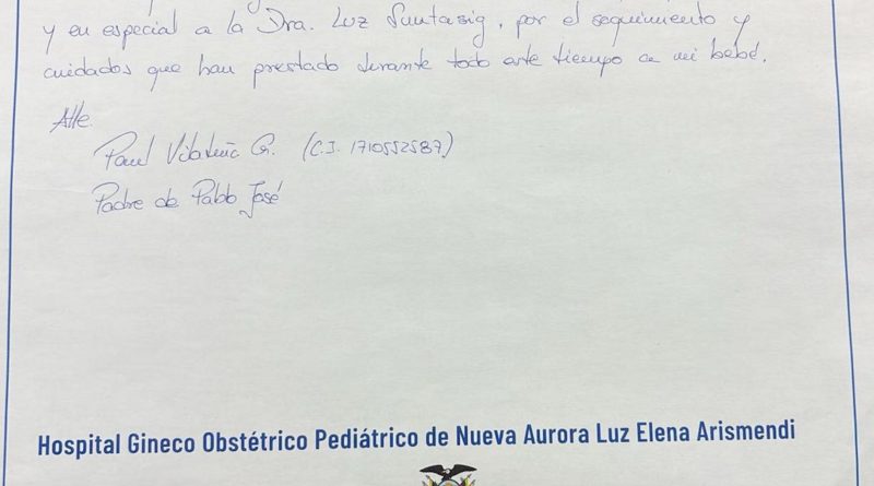 “Deseo dejar mi agradecimiento a la Institución y su personal, y en especial a la Dra. Suntasig por el seguimiento y cuidados que han provisto durante todo este tiempo a mi bebé.”