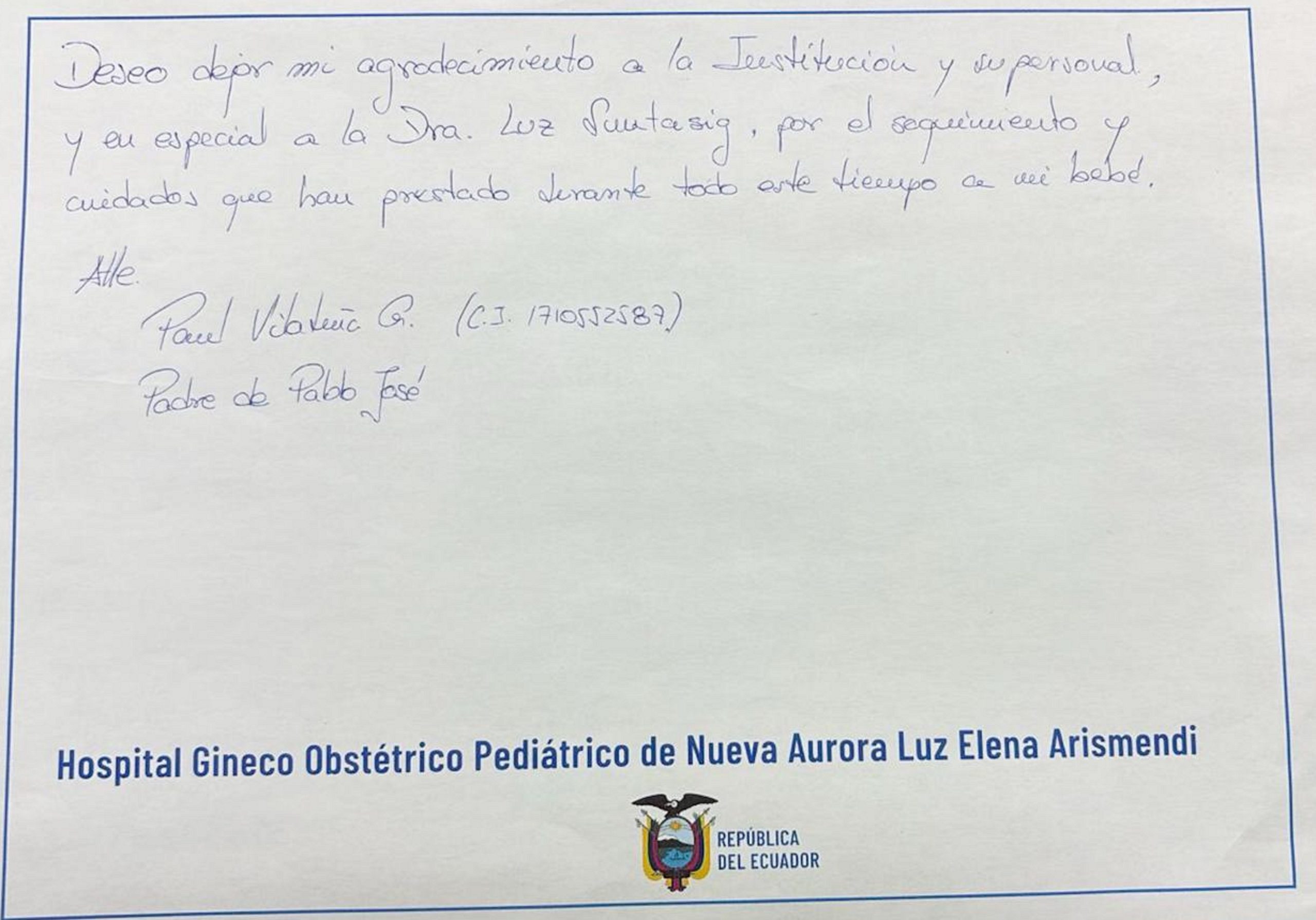 “Deseo dejar mi agradecimiento a la Institución y su personal, y en especial a la Dra. Suntasig por el seguimiento y cuidados que han provisto durante todo este tiempo a mi bebé.”