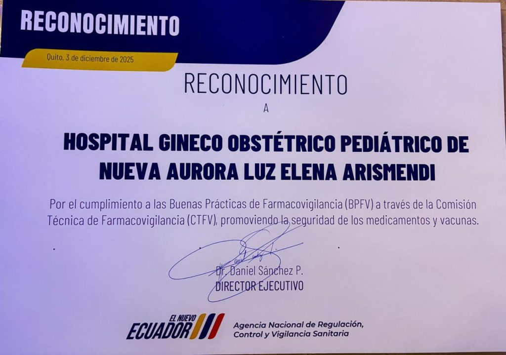 La Agencia Nacional de Regulación, Control y Vigilancia Sanitaria (ARCSA) otorgó un reconocimiento al Hospital Gineco Obstétrico Pediátrico de Nueva Aurora Luz Elena Arismendi