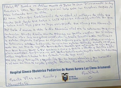 Con profunda gratitud, destaca la labor comprometida y humana del equipo de salud, quienes brindaron atención oportuna, profesional y llena de calidez, acompañando cada etapa de la recuperación de su hijo hasta lograr una evolución favorable.
