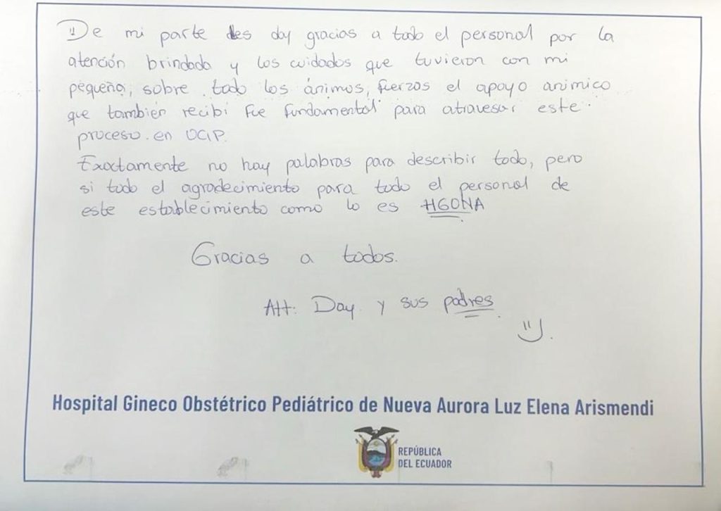 “De mi parte, agradezco profundamente a todo el personal por la atención brindada y los cuidados hacia mi pequeño. Los ánimos, la fortaleza y el apoyo emocional que recibimos fueron fundamentales para atravesar este proceso en UCIP.